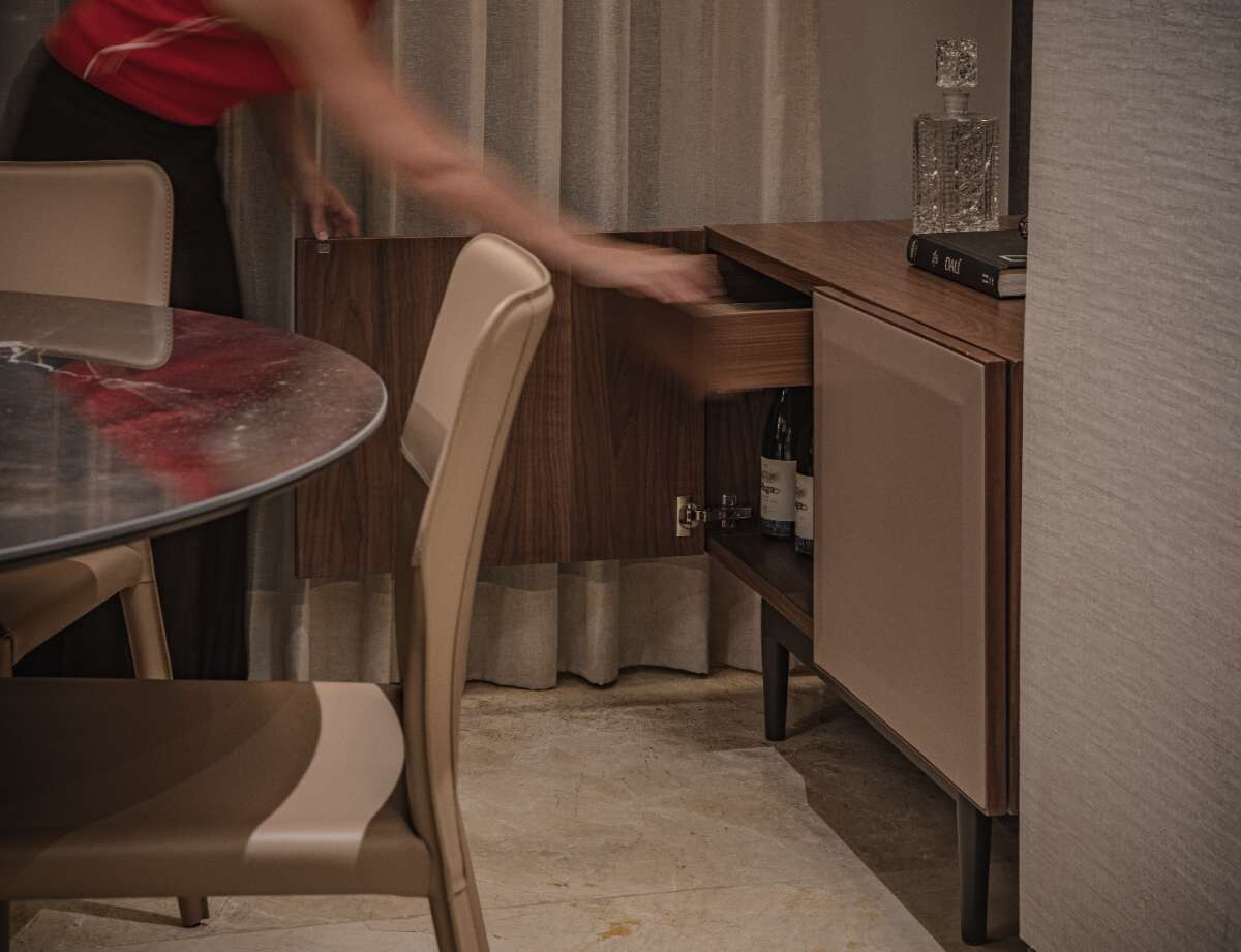 Disponible en dos dimensiones —120 cm y 180 cm—, ofrece un interior cuidadosamente diseñado con gavetas para cubiertos y entrepaños de vidrio, ideales para almacenar platos y otros elementos de la vajilla. Una propuesta versátil y elegante que realza cualquier ambiente comedor o sala auxiliar.