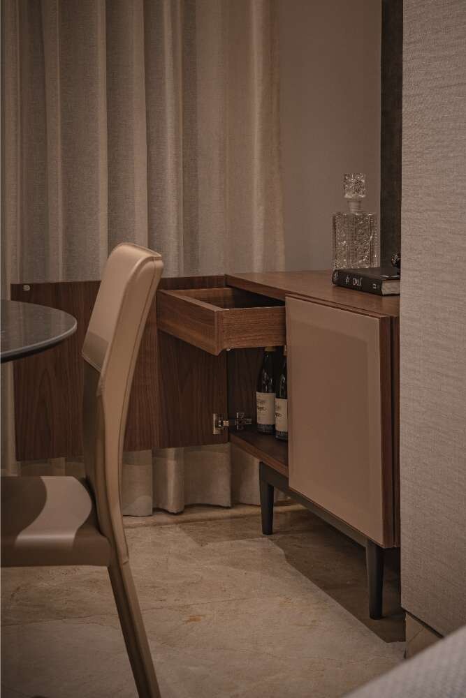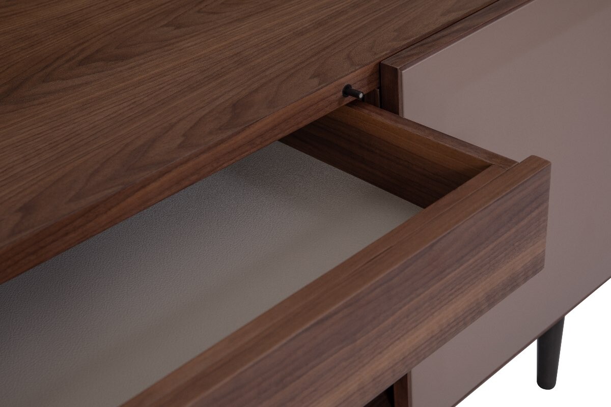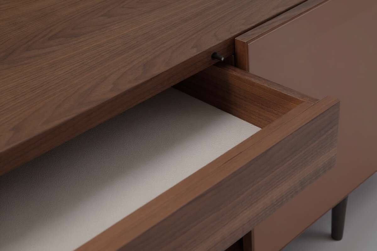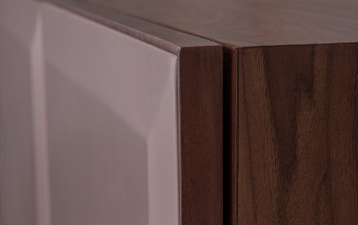 El Bife Arsizio es una pieza de alta calidad que fusiona funcionalidad y estilo refinado. Fabricado en madera enchapada y suspendido sobre una base lacada en tono sepia, destaca por la elaboración artesanal de sus frentes: un diseño diamantado en acabado lacado, enmarcado con canto en chapilla, que caracteriza a toda la familia Arsizio.