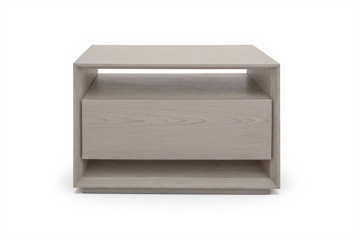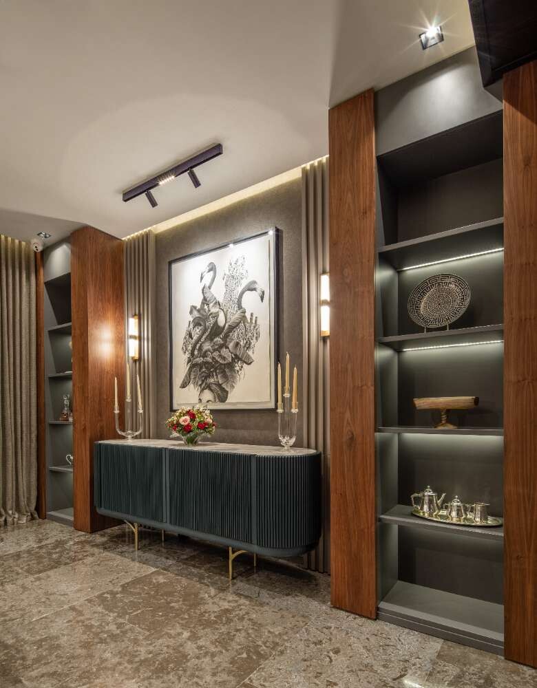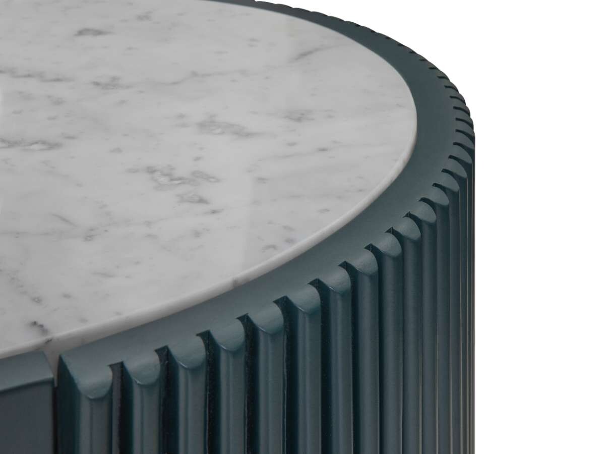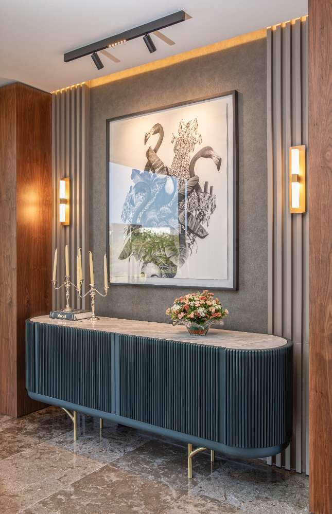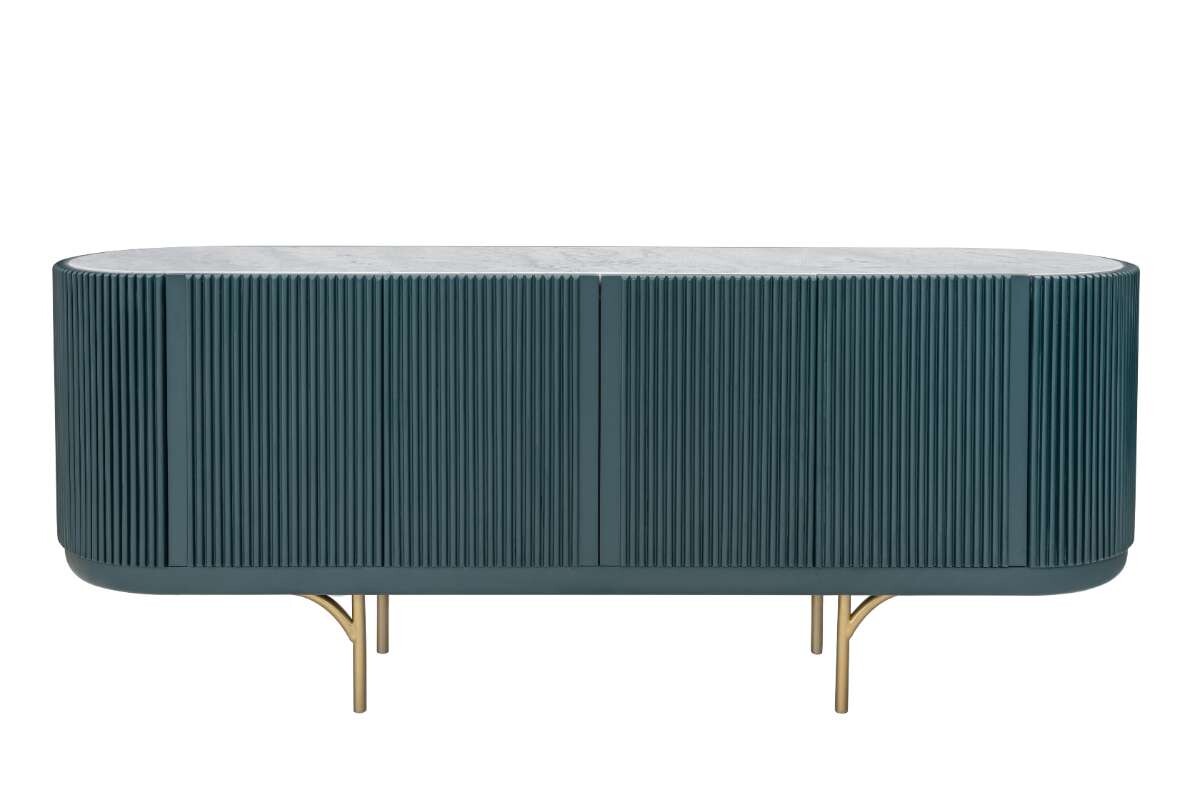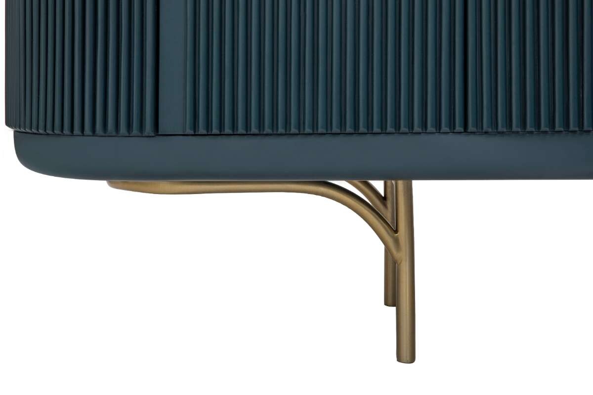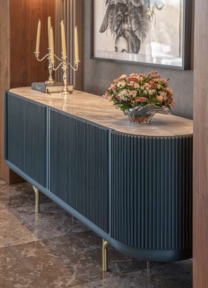 Las puertas y laterales, elaborados con listones de madera en forma de semicírculo, generan un sutil efecto de movimiento y suavizan las líneas del mueble. El contraste entre estos listones y el acabado lacado de la estructura exterior aporta profundidad visual y riqueza material. El interior, revestido en chapilla de madera, refuerza la sensación de calidad y calidez.
