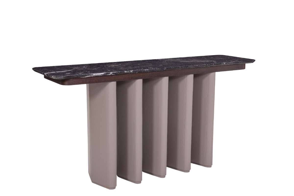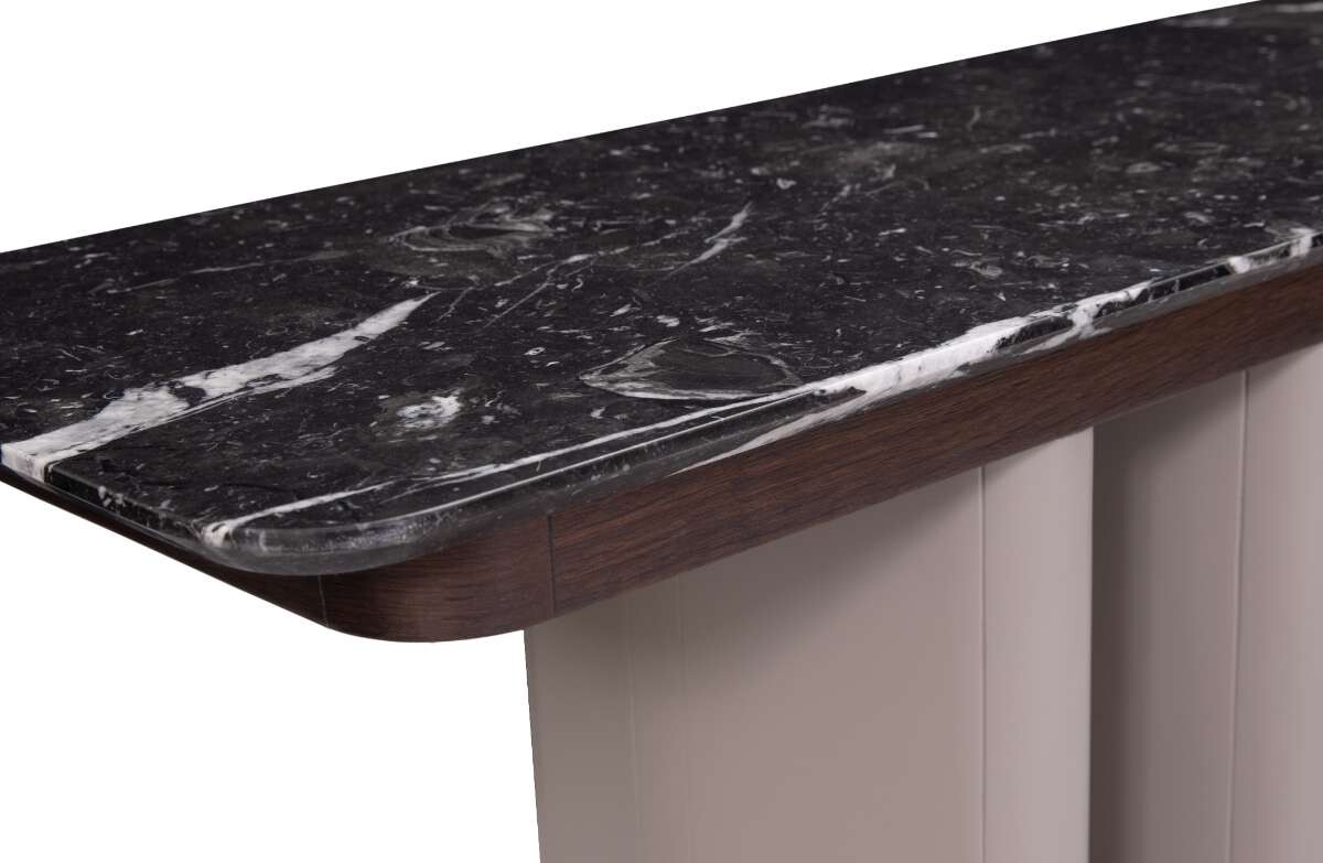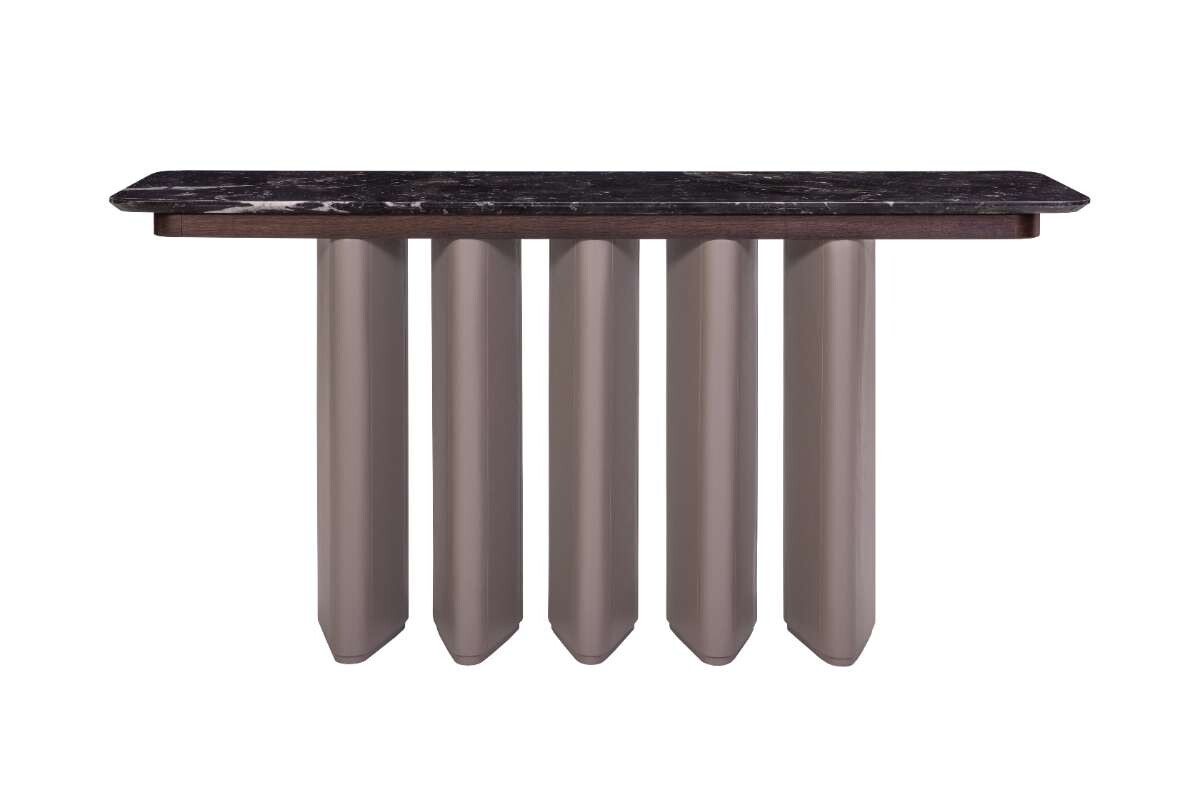 La Consola Erba destaca por la armonía entre forma y materialidad. Sus bases lacadas con geometría romboidal se conectan mediante una semicubierta en madera chapillada, lo que no solo garantiza estabilidad, sino que también proporciona un soporte sólido a la cubierta superior en mármol.